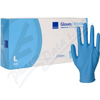 Vyšetřovací nitrilové rukavice Abena Classic, nepudrované, nesterilní. Dostupné ve velikostech S, M, L. Lze je použít pro různé úkony, jako je úklid, ošetřování, manipulace s potravinami, laboratorní práce, manipulace s léky, apod..