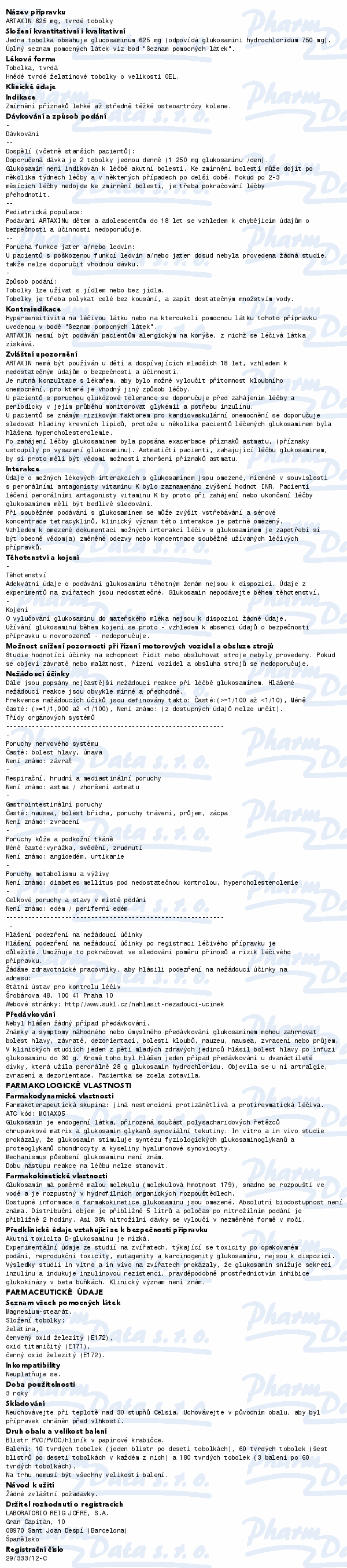 Artaxin patří do skupiny léčivých přípravků zvaných "jiná nesteroidní protizánětlivá a protirevmatická léčiva". Artaxin obsahuje léčivou látku glukosamin. Slouží ke zmírnění příznaků u lehké až středně těžké osteoartrózy kolene. Čtěte pozorně příbalový leták.