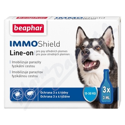 IMMO Shield Line-on pro středně velké psy je přípravek s aktivní látkou dimetikon (silikonový olej), který fyzikálním způsobem znehybňuje a zároveň likviduje blechy, klíšťata, komáry, roztoče, vši a všenky.