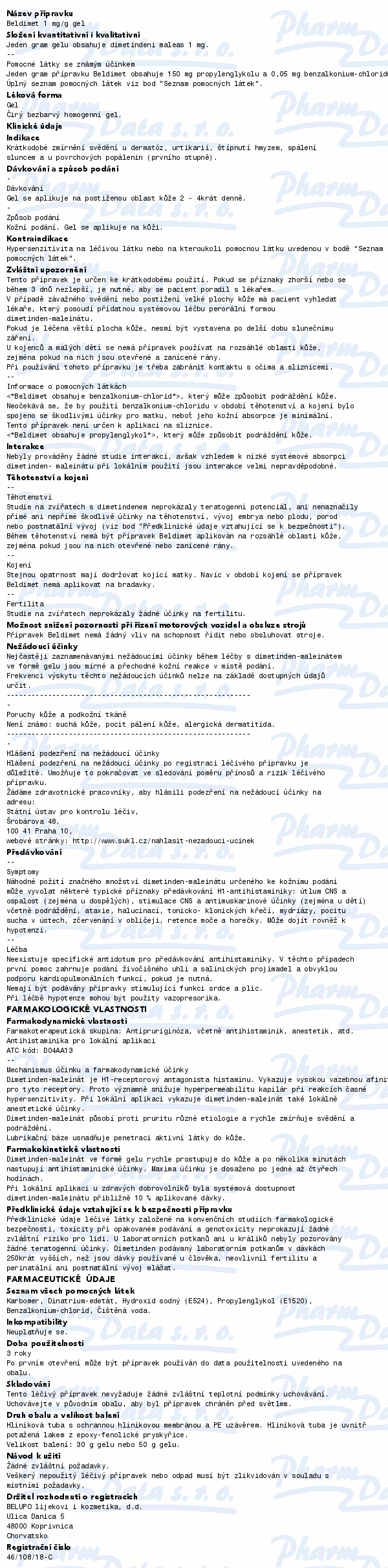 Beldimet obsahuje léčivou látku dimetinden-maleinát, která patří do skupiny antihistaminik. Používá se ke krátkodobému zmírnění svědění u dermatóz (svědivých onemocnění kůže), jako jsou kožní vyrážky, kopřivka, při štípnutí hmyzem a spálení sluncem. Čtěte pozorně příbalový leták.