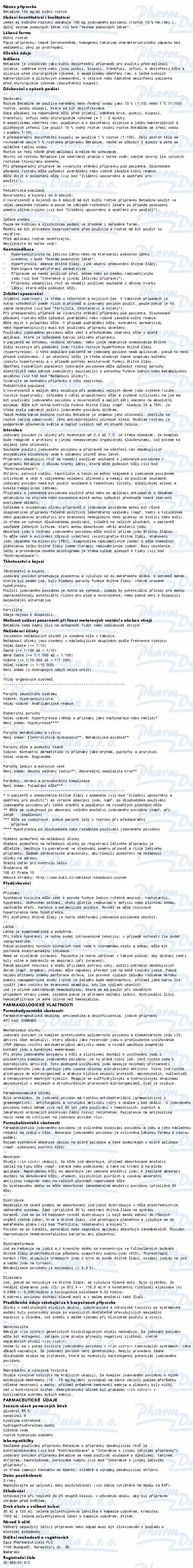 Betadine je dezinfekční prostředek, který ničí řadu choroboplodných zárodků (antimikrobiální účinek) a je vhodný k dezinfekci pokožky a sliznic. Čtěte pozorně příbalový leták.