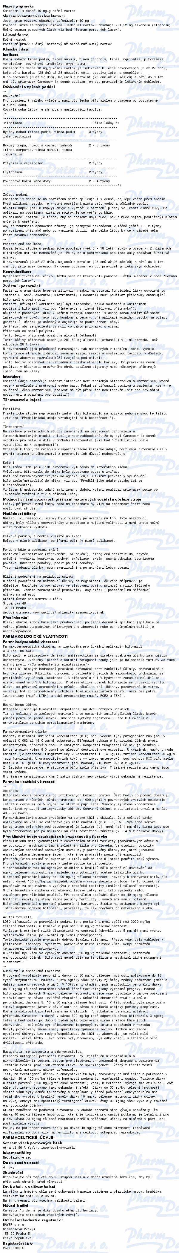 Léčivá látka přípravku Canespor 1x denně roztok je lokální antimykotikum se širokým spektrem účinku k místní léčbě kožních infekcí vyvolaných kvasinkami, plísněmi a jinými houbami. Čtěte pozorně příbalový leták.