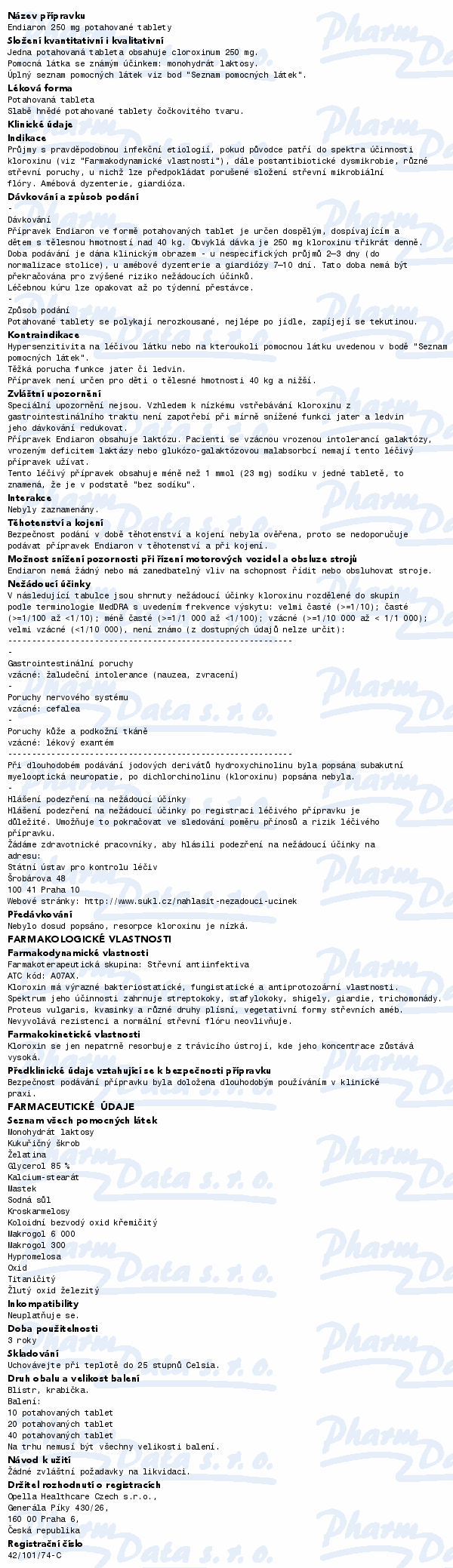 Přípravek Endiaron je střevní dezinficiens, které se používá u některých infekčních průjmů. Je účinný nejen proti bakteriím, nýbrž i proti některým prvokům, kvasinkám a plísním. Neovlivňuje mikroorganizmy žijící normálně ve střevě. Čtěte pozorně příbalový leták.