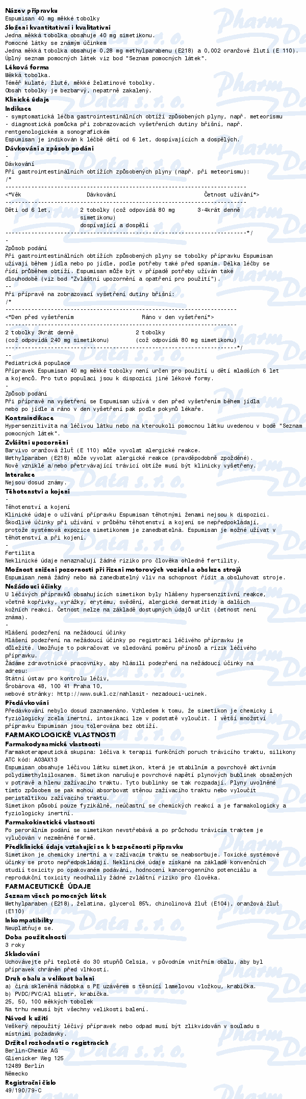 Espumisan je léčivý přípravek, který účinně odstraňuje pocit tlaku v břiše, pocit plnosti a plynatost. Espumisan může být užíván dlouhodobě, nemá vliv na trávení, i bez zapití se snadně polyká a je bezpečný i pro těhotné ženy a kojící matky. Čtěte pozorně příbalový leták.