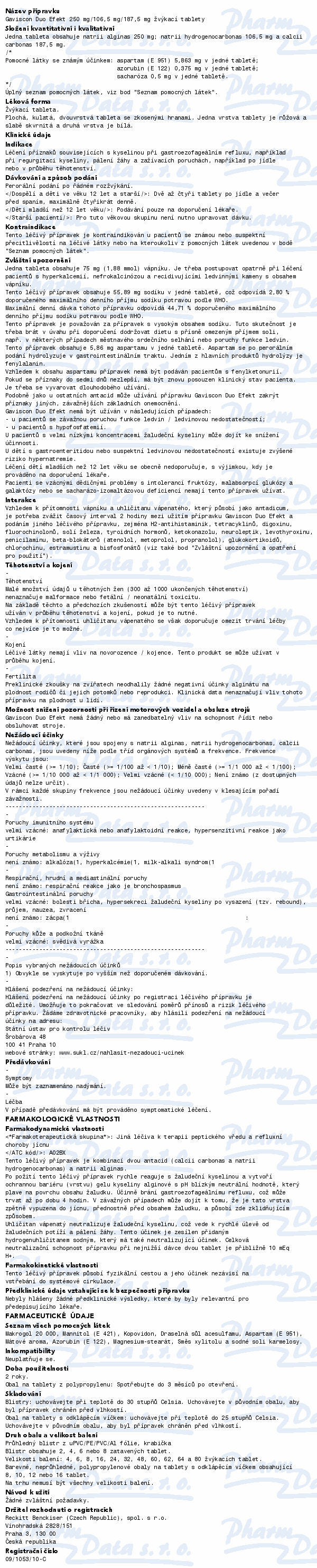 Gaviscon Duo Efekt Žvýkací tablety je kombinace dvou antacid (uhličitanu vápenatého a hydrogenuhličitanu sodného) a alginátu a působí dvojím způsobem: odstraňuje bolest a zažívací potíže; utišuje pálivou bolest na hrudníku způsobenou žaludečním obsahem. Čtěte pozorně příbalový leták.