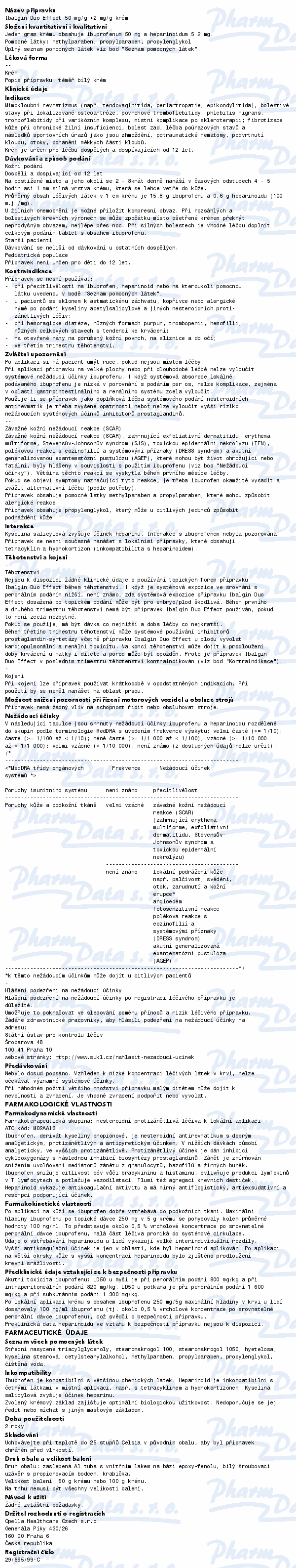 Ibalgin Duo Effect krém obsahuje léčivé látky ibuprofen a heparinoid a užívá se k léčbě poúrazových stavů a následků sportovních úrazů jako jsou otoky a krevní podlitiny, podvrtnutí kloubu, poranění měkkých částí kloubů a k léčbě bolesti zad. Čtěte pozorně příbalový leták.
