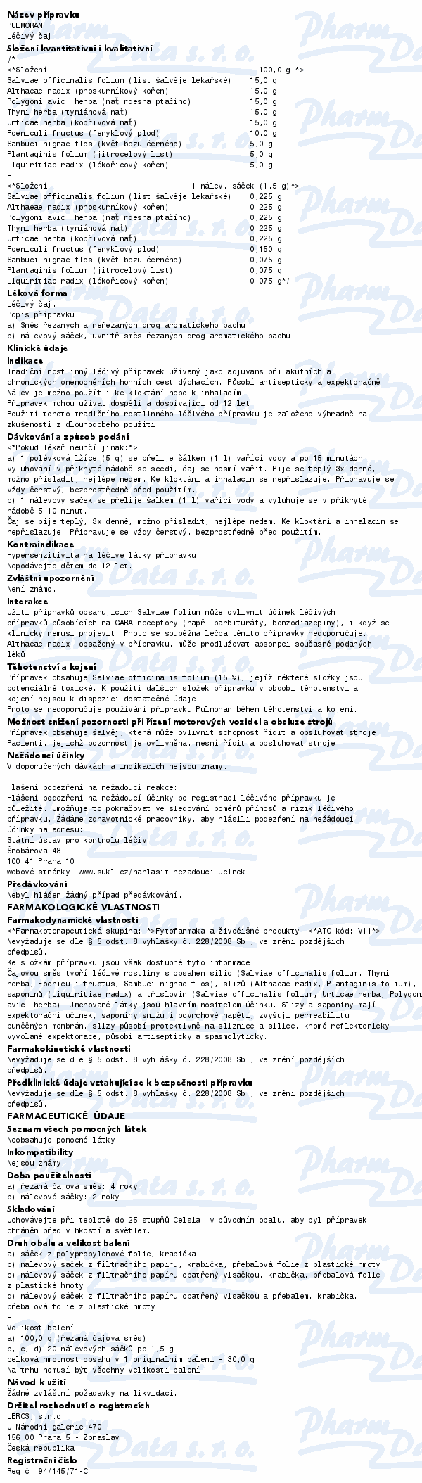 LEROS Pulmoran pomocný lék při chorobách horních cest dýchacích. Působí antisepticky, usnadňuje odkašlávání. Nálev je možno použít i ke kloktání nebo k inhalacím. Čtěte pozorně příbalový leták.