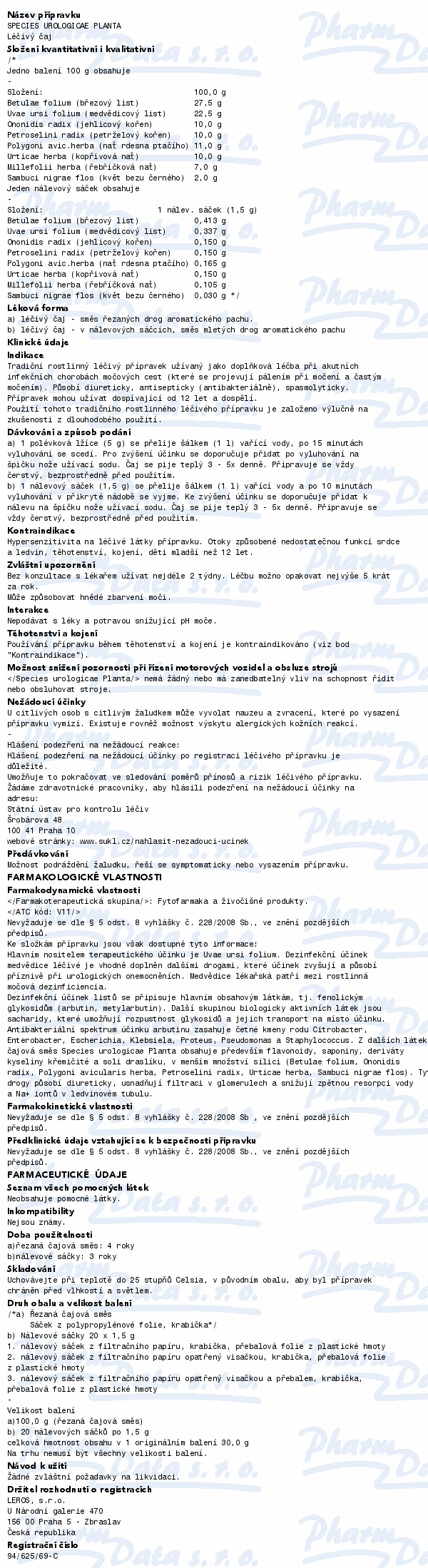 Leros Species urologicae Planta pomocný lék při zánětlivých chorobách močových cest. Působí močopudně, antisepticky, uvolňuje křeče hladkého svalstva. Čtěte pozorně příbalový leták.
