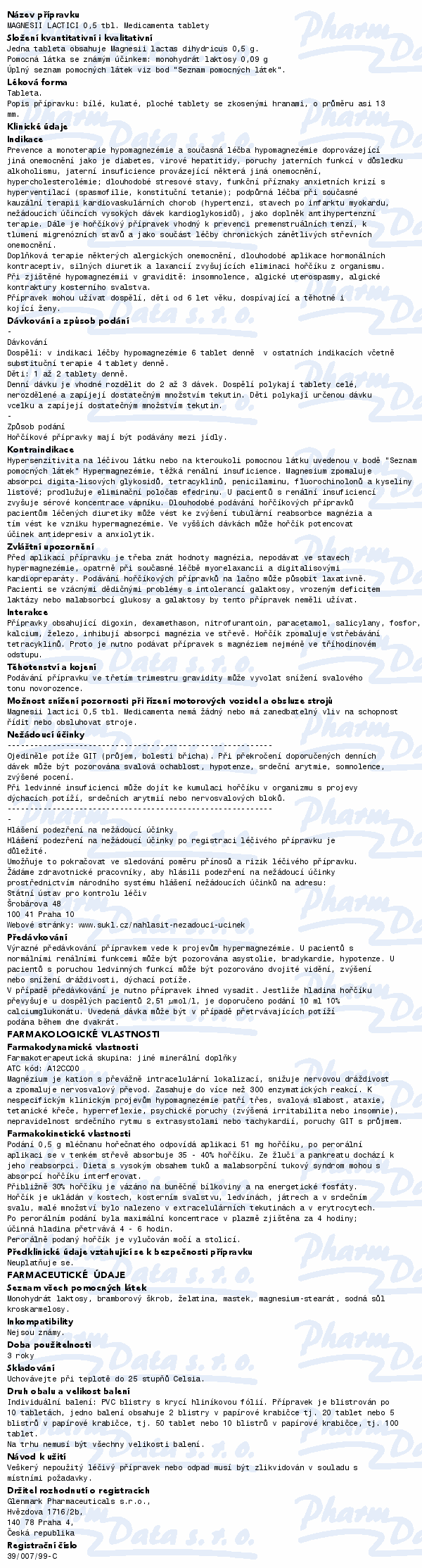 Přípravek Magnesii Lactici 0.5 Tbl.MVM por.tbl.nob.100x0.5g se používá k prevenci vzniku nedostatku hořčíku, který může provázet řadu onemocnění: cukrovku, virové záněty jater (hepatitidy), poruchy jaterních funkcí při alkoholismu, poruchy jaterních funkcí provázející některá jiná onemocnění. Na doporučení lékaře lze přípravek užívat k doplňkové léčbě chorob oběhového systému a srdce (vysoký krevní tlak, stavy po infarktu myokardu, angina pectoris, nežádoucí účinky vysokých dávek digitalisových srdečních glykosidů, některé poruchy srdečního rytmu). Dále může být přípravek doporučen lékařem k užívání při nedostatku hořčíku v organismu v důsledku jednostranné výživy - diety, nebo při současné léčbě léky, které k nedostatku hořčíku v organismu vedou (např. hormonální antikoncepční přípravky, některé močopudné a projímavé léky). Na doporučení lékaře je přípravek vhodný k prevenci premenstruálních tenzí, k tlumení migrenózních stavů a jako součást léčby chronických zánětlivých střevních onemocnění. Potřeba hořčíku stoupá se stupněm těhotenství, proto je přípravek indikován rovněž u těhotných žen při nespavosti, bolestivých stazích dělohy a bolestech kosterního svalstva. O použití přípravku v těhotenství rozhodne lékař. Přípravek mohou užívat dospělí, děti nad 6 let věku, mladiství a těhotné i kojící ženy. Těhotné a kojící ženy a děti užívají přípravek při laboratorně prokázaném nedostatku hořčíku v organismu.