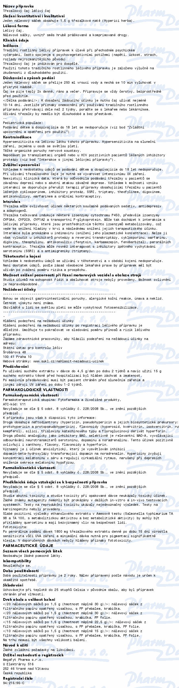 Tradiční rostlinný léčivý přípravek k úlevě při přechodném psychickém vyčerpání, často spojené s psychovegetativními potížemi (napětí, úzkost, strach). Čtěte pozorně příbalový leták.