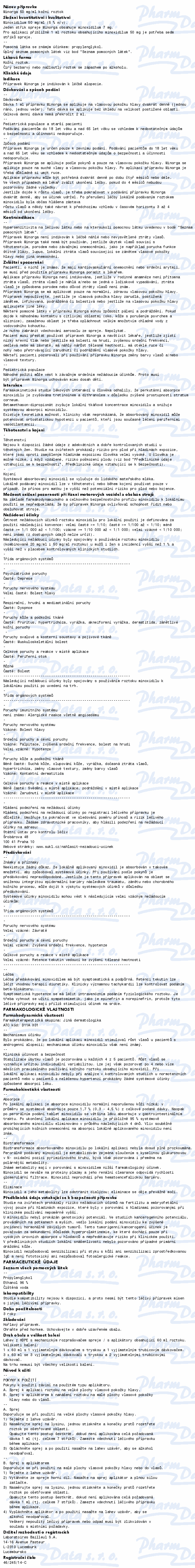 Volně prodejný léčivý přípravek k léčbě alopecie. Přípravek Minorga je indikován zejména u mužů, kteří trpí úbytkem nebo zeslabením vlasů na temeni hlavy a u žen, které trpí celkovým zeslabením vlasů. Čtěte pozorně příbalový leták.