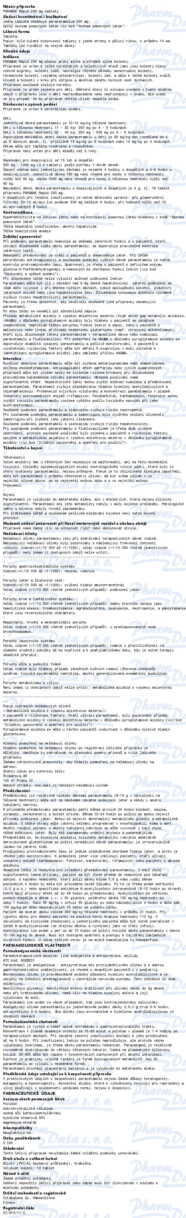Patří mezi léky nazývané analgetika, antipyretika. Léčivá látka je paracetamol. Tlumí bolest a snižuje zvýšenou tělesnou teplotu. Nedráždí žaludek a nevyvolává krvácení, mohou jej tedy užít i nemocní s žaludečními a dvanáctníkovými vředy. Čtěte pozorně příbalový leták.