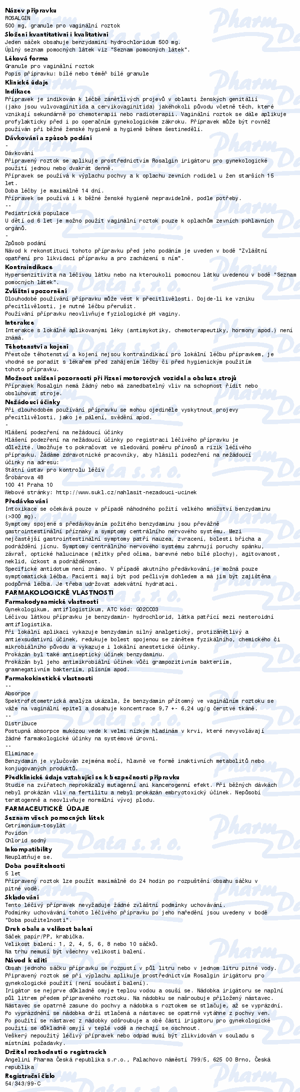 Rosalgin jsou granule pro vaginální roztok. Používá se k výplachům pochvy a oplachům zevních rodidel při zánětlivých onemocněních ženského pohlavního ústrojí. Léčivá látka benzydamin-hydrochlorid patří mezi nesteroidní protizánětlivé látky. Čtěte pozorně příbalový leták.