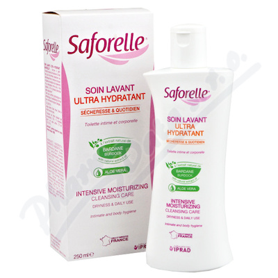 SAFORELLE ULTRA-hydratační gel pro intimní hygienu je jemná čistící péče bez obsahu mýdla. Obsahuje rostlinný extrakt z lopuchu většího, který je znám pro své zklidňující a protisvědivé účinky, a extrakt z aloe vera s vysoce hydratačním efektem.