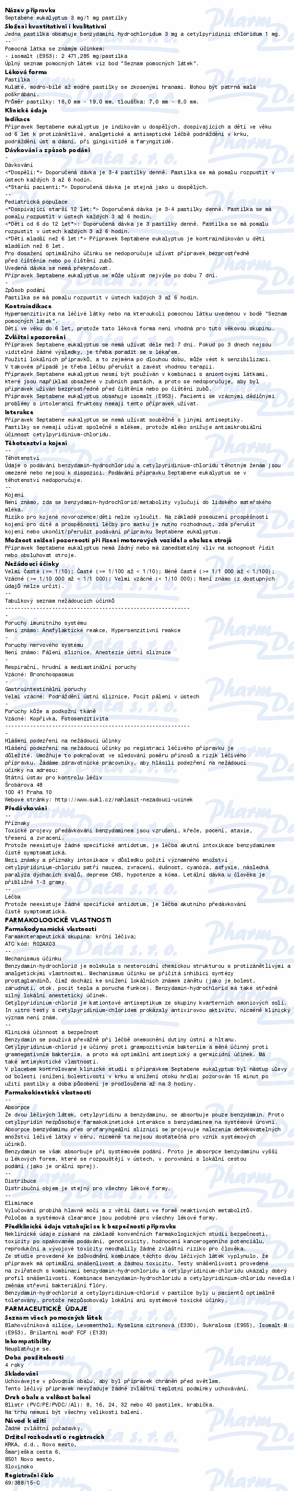 Přípravek Septabene eukalyptus je indikován u dospělých a dětí ve věku od 6 let k protizánětlivé, analgetické a antiseptické léčbě podráždění v krku, podráždění úst a dásní, při gingivitidě, faryngitidě a laryngitidě. Čtěte pozorně příbalový leták.