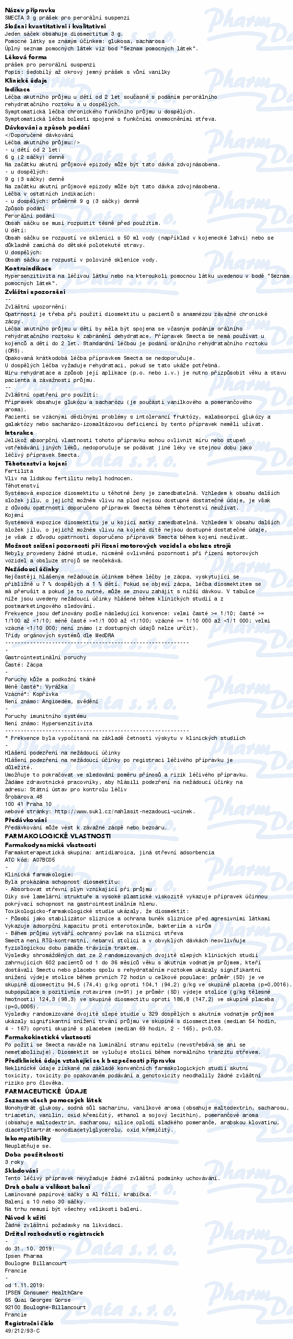 Smecta je přírodní čištěný jíl s vysokou vazebnou kapacitou, jenž je schopen se vázat s hlenem sliznice zažívacího traktu a zvyšuje tak jeho kvalitu a množství. Touto cestou chrání sliznici proti infekci a škodlivým látkám a umožňuje rychlejší uzdravení. Čtěte pozorně příbalový leták.