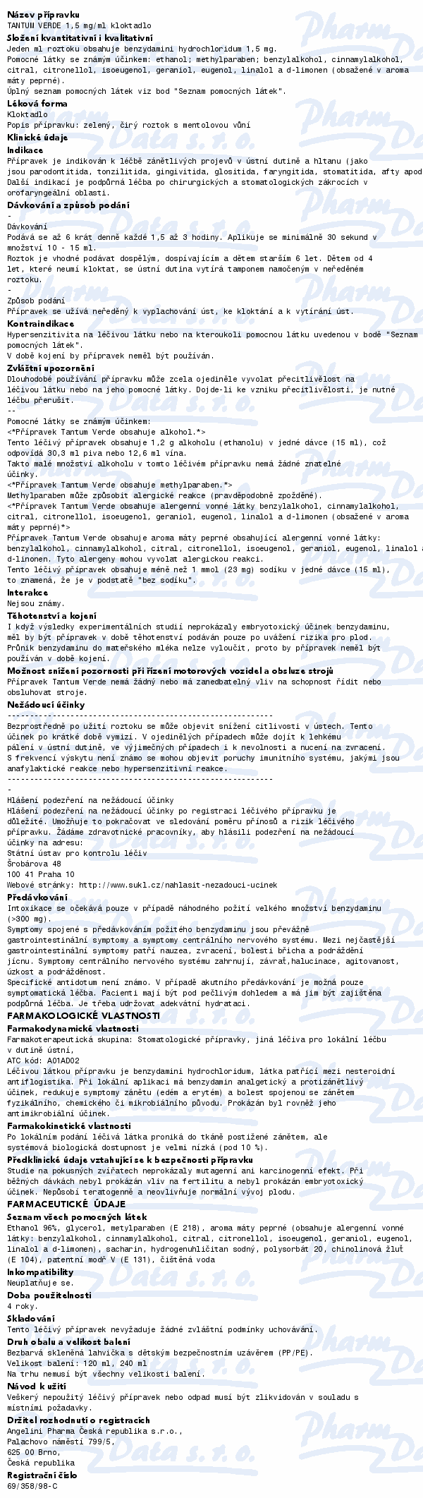 Přípravek Tantum Verde je roztok, který je určen k vyplachování ústní dutiny, ke kloktání či vytírání úst – potírání postižených míst. Léčivá látka benzydamin-hydrochlorid má výrazné protizánětlivé, dezinfekční a bolest tlumící účinky. Čtěte pozorně příbalový leták.