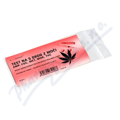 Rychlý jednostupňový kontrolní test pro zjištění AMP, COC, MET, MOR, THC v moči. Rozliší koncentraci 20-2000 ng/mL v čase 1 hod -5 dnů. Každá droga má v testovací kazetě svůj proužek, který bude při pozitivním nálezu bez reakce.